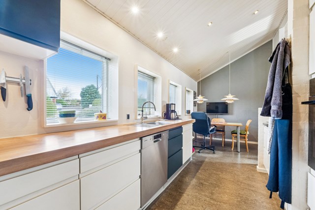 I centrum af boligen ligger de fælles opholdsrum, hvor familielivet kan folde sig ud. Her er både et hyggeligt spisekøkken og to stuemiljøer. Den ene stue byder på brændeovn og varme stemninger i de kolde måneder, mens den anden har direkte udgang til haven og inviterer solen helt indenfor.
