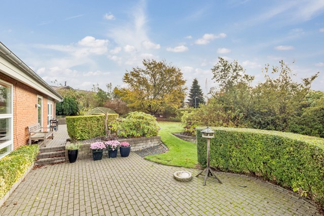 Grunden på 903 kvadratmeter er anlagt med fokus på både privatliv og ophold. Haven vender stik syd, hvilket sikrer masser af sol dagen igennem. Den store fliseterrasse danner rammen om lange sommerdage i læ af fine hække, mens børnene kan lege på den grønne plæne.