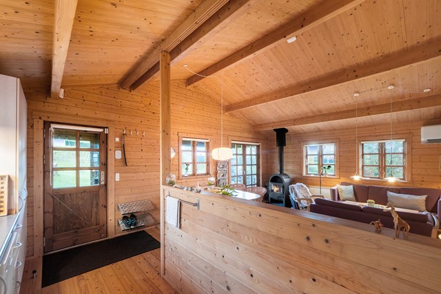 Derudover er de 63 m2 også godt fordelt på et pænt badeværelse, to fine værelser med indbyggede skabe og et åbent opholdsrum, hvor brændeovnen bidrager til den gode stemning. Brændeovnen suppleres desuden af en luft-til-luft-varmepumpe.
