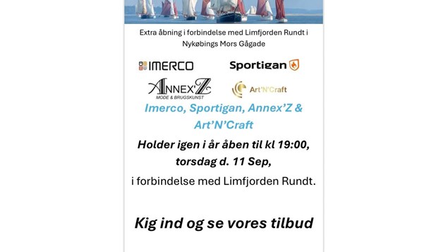 Extra-åbent til Limfjorden Rundt! Torsdag, når skibene rammer Nykøbing, er vi 4 butikker, der holder extra-åbent til kl 19 med gode tilbud! Hos os giver vi 20 % rabat på de viste DMC og Hardicraft-kits - der er til hækling, strik, broderi og punch -needle. Tilbuddet gælder KUN denne dag!