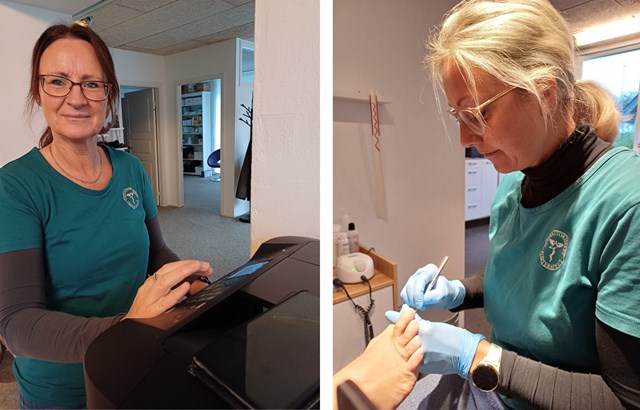 Til venstre ses Ann-Marie Jakobsen der ordner kontorarbejde inden dagens arbejde og til højre er Pernille Hansen i gang med fodbehandling (Foto: Privat)
