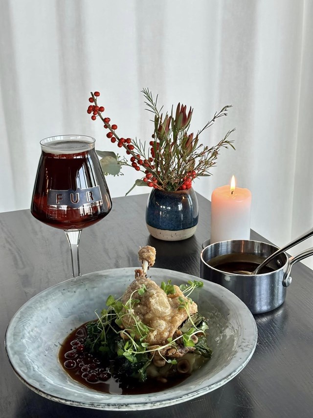 HOVEDRET: Confiteret andelår med kartoffelkompot, ristede kålskud, tyttebær, julesauce samt hasselnødder