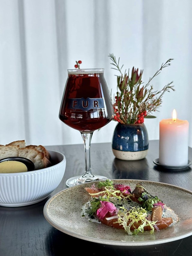 FORRET: Koldrøget laks med peberrodsfløde, dildolie, hybenrose, syltede grønne jordbær, purløg, sennepsurter samt friséesalat