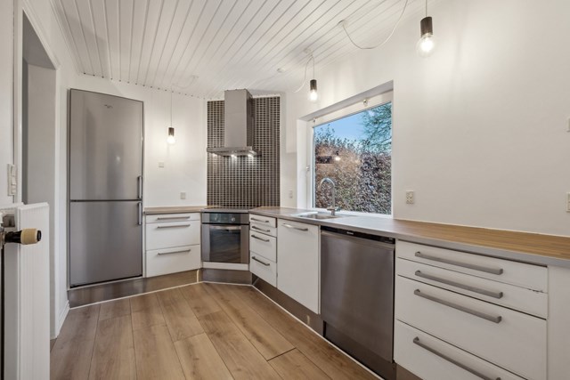 Udenfor kan du nyde en overdækket sydvendt terrasse, som fører videre til haven – et perfekt sted at nyde privatlivets fred. Villaen fremstår med en flot fliseindkørsel foran og en have bagtil, omgivet af en høj hæk.