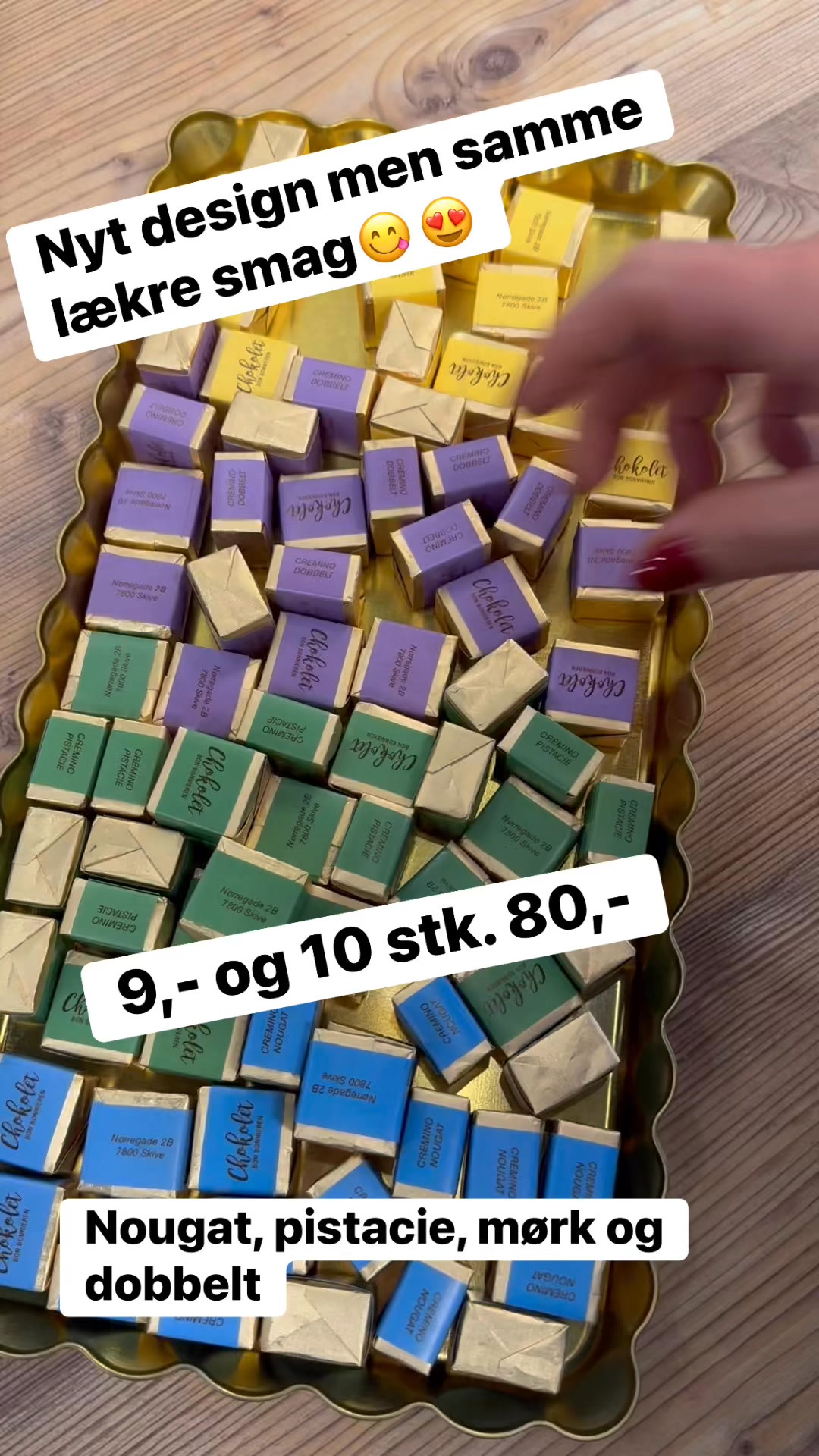 Nyt design men samme lækre smagnougat, pistacie, mørk og dobbelt lys og mørk
