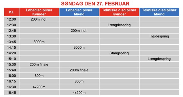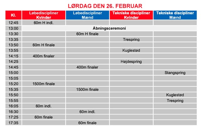 Nederst i artiklen kan du finde den samlede tidsplan over, hvornår de forskellige discipliner holdes.