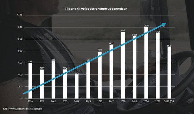 Flere og flere unge får i disse år smag på at blive lastbilchauffør, og det gælder ikke kun de unge mænd. Også antallet af unge kvinder, der søger ind på vejgodstransportuddannelsen, er i stigning. Trods den positive udvikling kan transportbranchen godt bruge flere nyuddannede chauffører, for ifølge branchens prognoser kommer der til at mangle op mod 2.500 chauffører inden for få år.