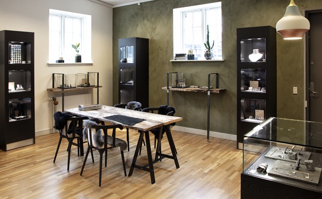 Hos Guldsmed Ø udgør den ene halvdel butik, og den anden halvdel er lavet til værksted. Her kan kunderne i ro og mag sidde sammen med Marie, og lade sine ønsker komme til orde.