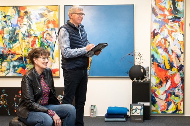 “Det er også muligt at have en udstilling i virksomheden med 10-15 kunstværker, som hænger der i en måned. Vi sørger for alt det praktiske, så du kan nyde de smukke værker i fred og ro.”