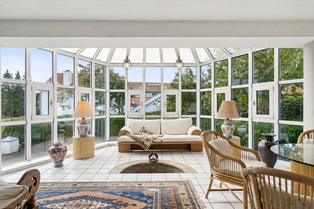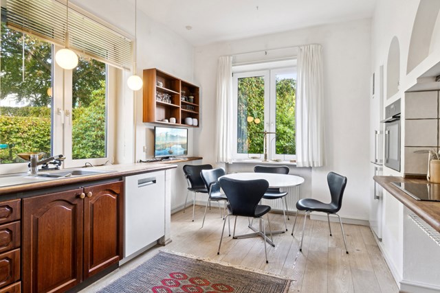 I stueplan samles hjemmets mange leverum. Her ligger pejsestue, spisestue og opholdsstue i harmonisk forlængelse af hinanden, og for enden åbner en stor, lysfyldt udestue sig mod haven. Køkkenet fremstår indbydende og funktionelt, mens den smukke hall fungerer som boligens naturlige omdrejningspunkt – det er også herfra, trappen snor sig op til førstesalen.