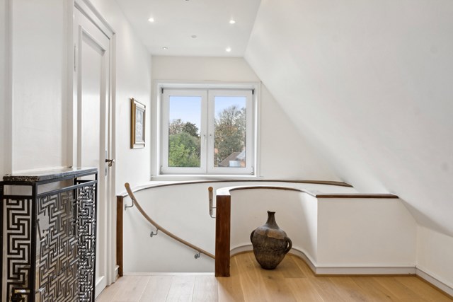 På førstesalen finder man en række gode værelser, som gør boligen oplagt til den pladskrævende familie. Det store soveværelse har direkte udgang til en sydvestvendt altan, hvor udsigten kan nydes i rolige omgivelser. I alt rummer boligen tre badeværelser og to gæstetoiletter, hvilket sikrer god komfort i hverdagen.