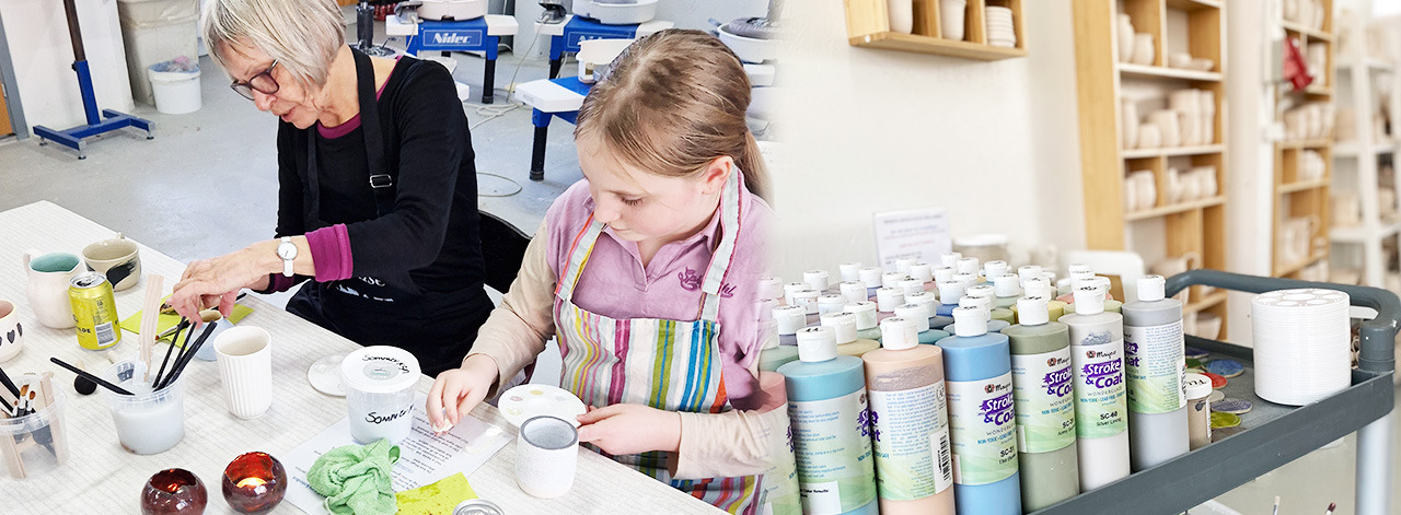 Vælg dit eget stykke keramikDeltagerne kan vælge mellem et stort udvalg af keramik, herunder små og mellemstore skåle, krus, kopper, vaser, kander og figurer. Priserne starter fra 125 kr. og op, og du betaler kun for det keramik, du vælger at dekorere.
