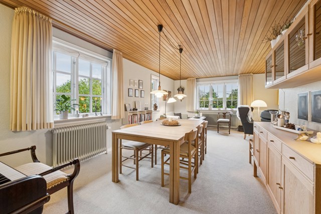 Fra køkkenet er der udsigt til byparken, mens stuen byder på frit udsyn til haven og det grønne uderum. Hjemmet fremstår velholdt og giver et godt udgangspunkt for at sætte sit eget præg.