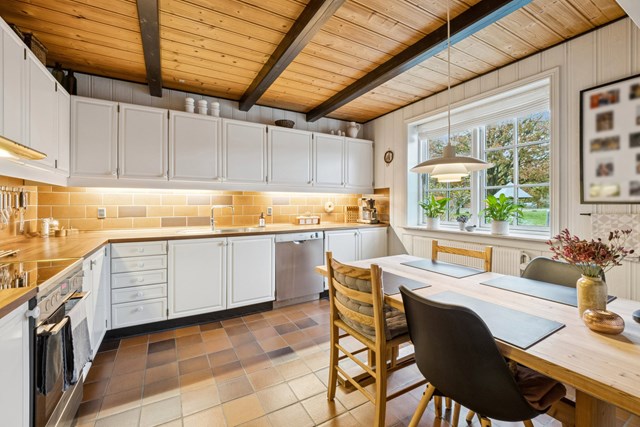 Udendørs byder boligen på flere fine terrasser. Mod øst findes en dejlig morgenterrasse, afskærmet af læhegn, hvor dagens første kop kaffe kan nydes i fred. Mod vest folder en lukket og solrig have sig ud med god plads til både leg, afslapning og sommerens grillmiddage. Hertil kommer en muret garage, som giver ekstra opbevarings- og parkeringsmuligheder.