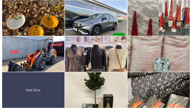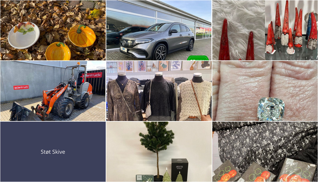 Art'n'Craft tilbyder Halloween-dekorationer som servietter og "spooky" tyl, perfekt til at skabe lidt uhygge. WIIBEN præsenterer nyt tøj til efterårets begivenheder, herunder julefrokoster. HILMARS ApS har LED juletræslys fra Deluxe homeart til julepynt. Pedersborg Vin sælger håndmalede italienske fajance skåle med efterårs- og Halloween-tema. G.R. BILER, SKIVE A/S har en næsten ny Mercedes-Benz EQA 250 klar til dem, der ikke vil vente på en fabriksny bil. GARDEROBEN tilbyder håndlavede raku nisser og engle som værtindegaver. Guldsmed Ø har nye diamanter og smaragder fra Antwerpen klar til salg næste uge. SCANTRUCK A/S fremhæver ugens brugte maskine, en Weycor AR380 Agrar fra 2023, klar til hurtig levering.
