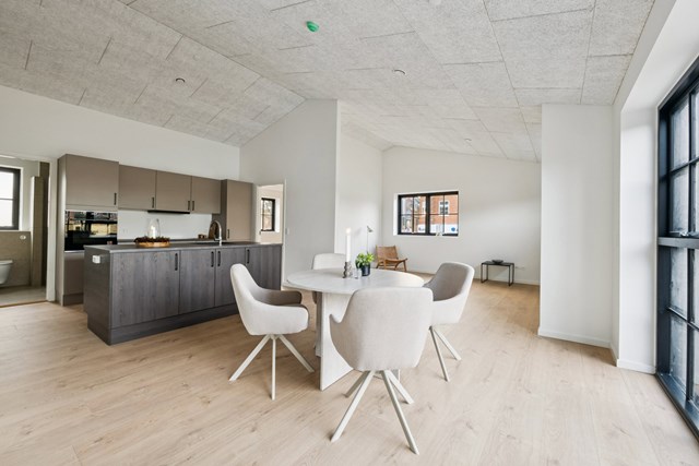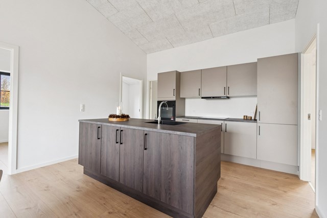 Køkken, badmiljøer og skydedøre i entréen er leveret af HTH. Entré og badeværelser har klinkegulve, mens opholdsrum er udført med slidstærkt højtrykslaminat i egelook.