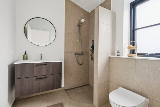 Boligen rummer et soveværelse med eget badeværelse samt yderligere to gode værelser. Der er desuden endnu et badeværelse, som er centralt placeret i huset. Det gør det oplagt som gæstetoilet. Gulvvarme er etableret i hele huset, og lofterne er ført til kip. Det skaber en behagelig rumfornemmelse.