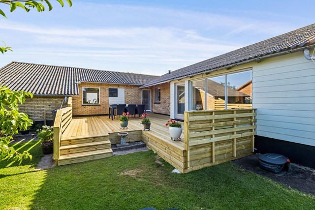 En stor, ny træterrasse er anlagt i læ af huset og danner de perfekte rammer for sommerdage og lange aftener udendørs.