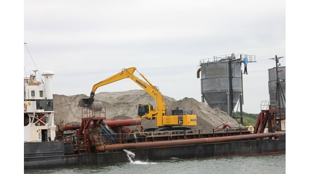 Den specialbygget gravemaskine bruger sin 13 meters rækkevidde til at sænke grabskovlen ned i lasten på skibene, fylde den og løfte materialerne til sigteanlægget på kajen.