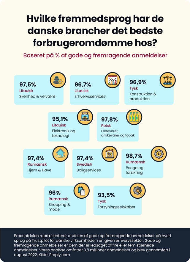 Preply ville også finde ud af, blandt hvilke nationaliteter de forskellige danske brancher har det bedste omdømme - igen baseret på den højeste andel af 4 og 5-stjernede anmeldelser.