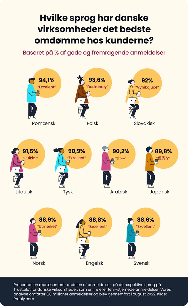- Anmeldere der taler Rumænsk har ifølge vores analyse de bedste erfaringer med danske virksomheder. Ved 94,1% af de anmeldelser vi fandt på rumænsk til danske virksomheder er der givet 4 eller 5 stjerner.