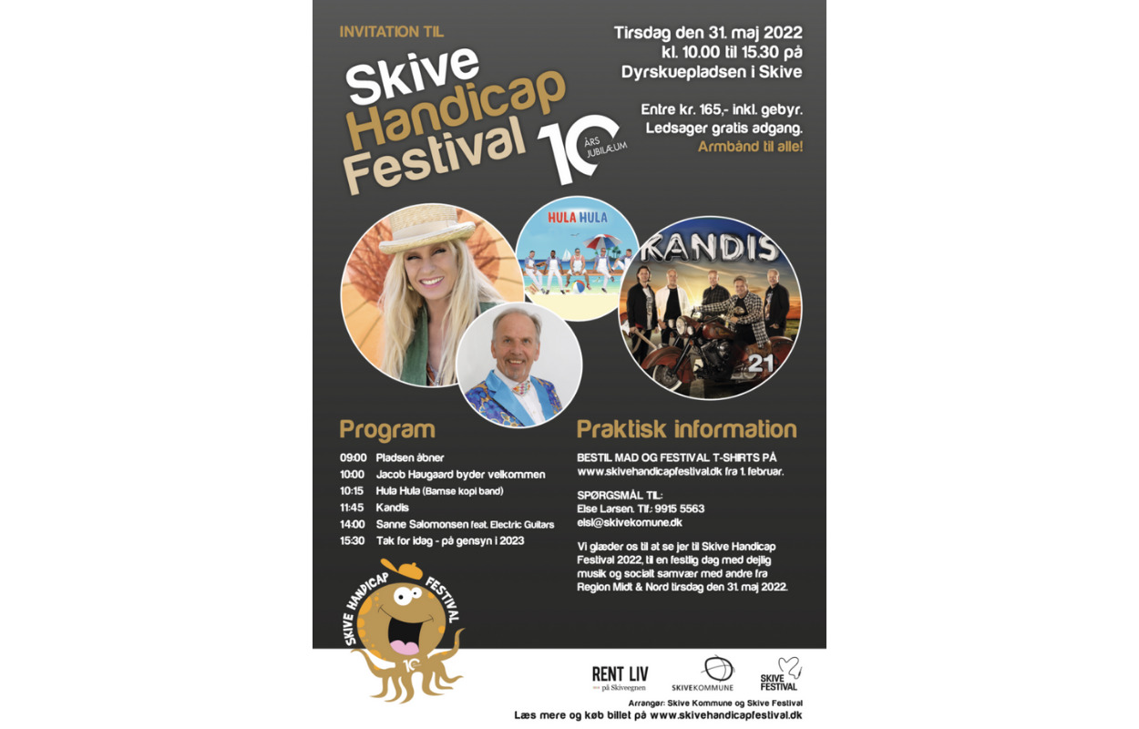 Når Skive Handicap Festival 2022 løber af stablen den 31. maj, kan festivalen fejre 10-års jubilæum. Dét bliver fejret med højt humør og fuld smæk på musikken.