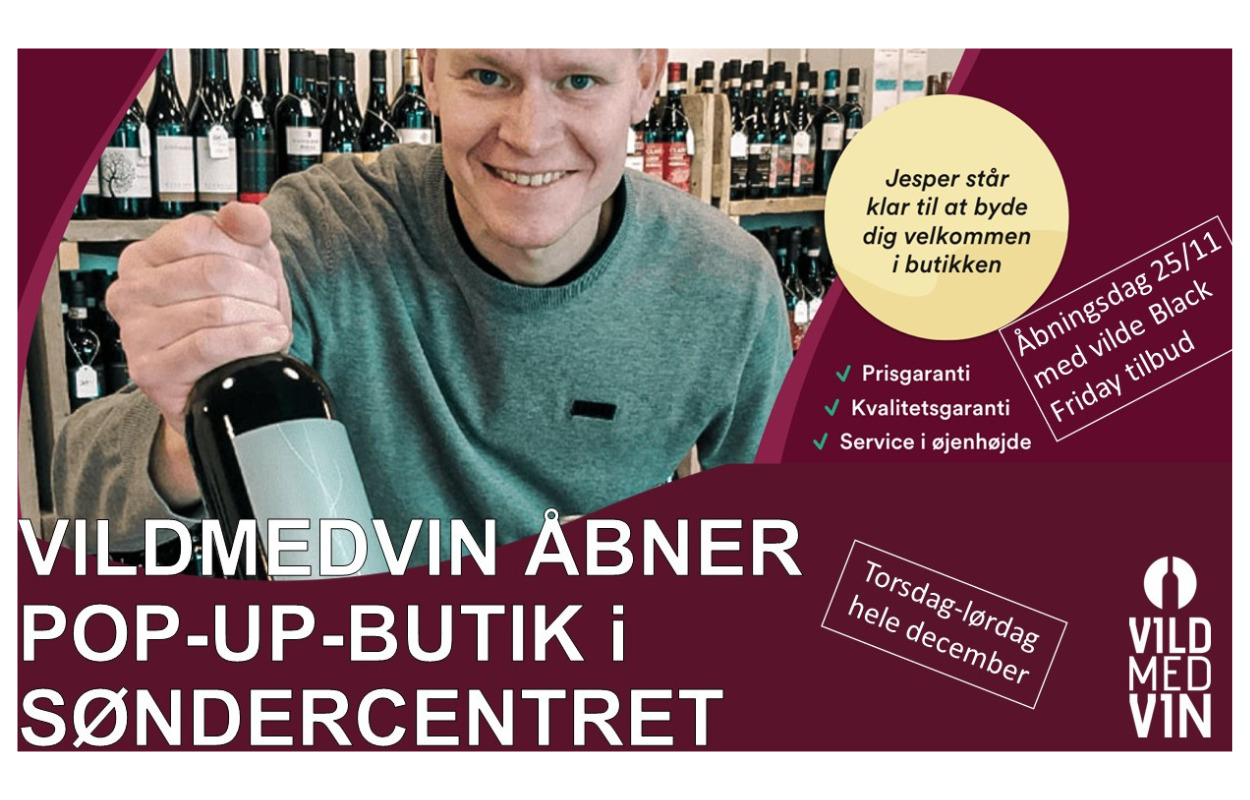 VildMedVin byder kunderne velkommen i en intim pop-up-butik lige overfor indgangen til Kvickly.