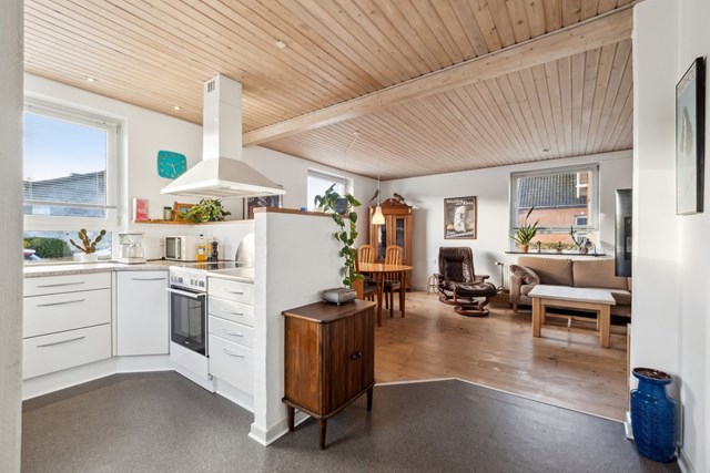 Indretningen omfatter en åben forbindelse mellem stue og køkken, så man nemt kan følge med i både madlavning og samtaler. Dertil kommer et stort soveværelse med garderobeskab og et værelse, velegnet som børneværelse eller hjemmekontor. Stueetagen afrundes med et badeværelse og en rummelig udestue med udsigt over haven.