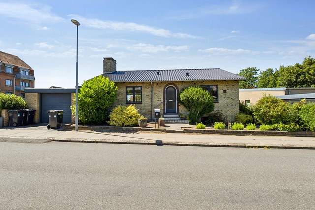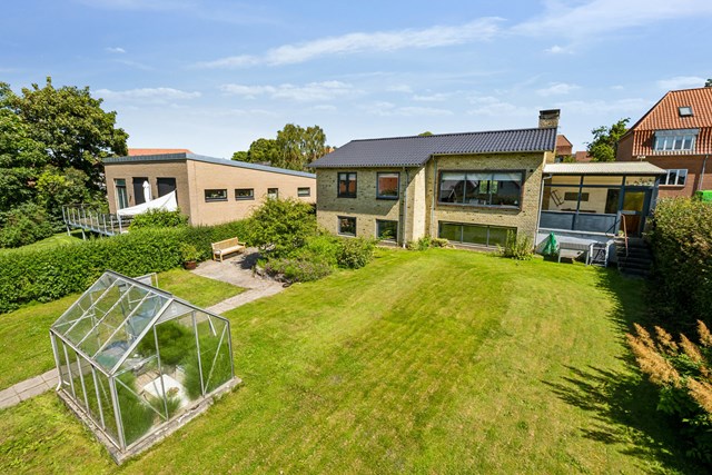 Grunden på 588 kvadratmeter byder på en dejlig, frodig have med plads til både leg og afslapning. Den solrige terrasse indbyder til morgenkaffe og hyggelige sommeraftener, mens børnene kan boltre sig på plænen.