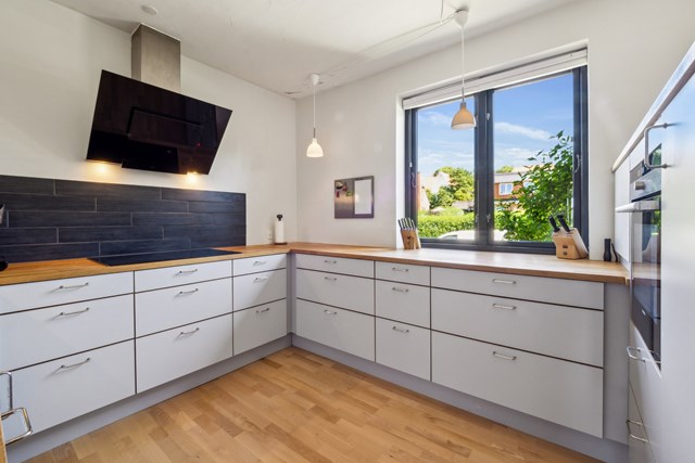 Det åbne køkken er praktisk indrettet med moderne faciliteter og giver mulighed for at lave mad, mens familien samles omkring én. Planløsningen skaber en naturlig sammenhæng mellem opholdsrum og køkken, hvilket gør boligen ideel til både hverdag og gæster.